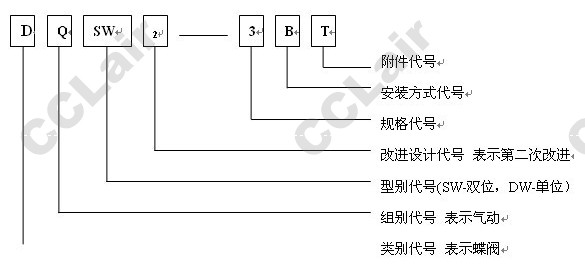 DQSW2 — 3BT表示經(jīng)第二次改進(jìn)的、帶氣源三聯(lián)件的、通徑為¢175的、水平安裝的氣動雙位蝶閥。