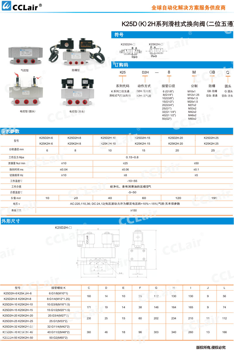K25D2H-6,K25D2H-8,K25D2H-10,K25D2H-25,K25K2H-15,K25K2H-20,K25K2H-25,二位五通滑柱式氣控換向閥