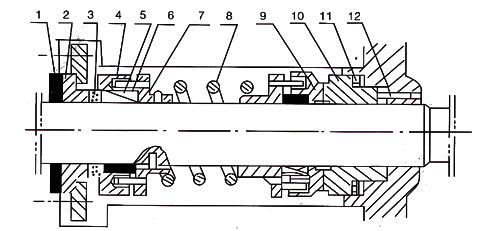 雙機械密封裝置主要由墊圈(1)內靜環(huán)(2)動環(huán)(3)動環(huán)體(4)密封圈(5)(6)推環(huán)(7)彈簧(8)動環(huán)(9)外靜環(huán)(10)靜環(huán)密封圈(11)防轉銷(12)等主要零件組成。