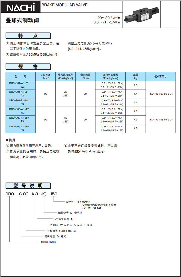 ORO-G01-W1-20,ORO-G01-W3-20,ORO-G03-W1-J50,ORO-G03-W3-J50,NACHI疊加式制動(dòng)閥