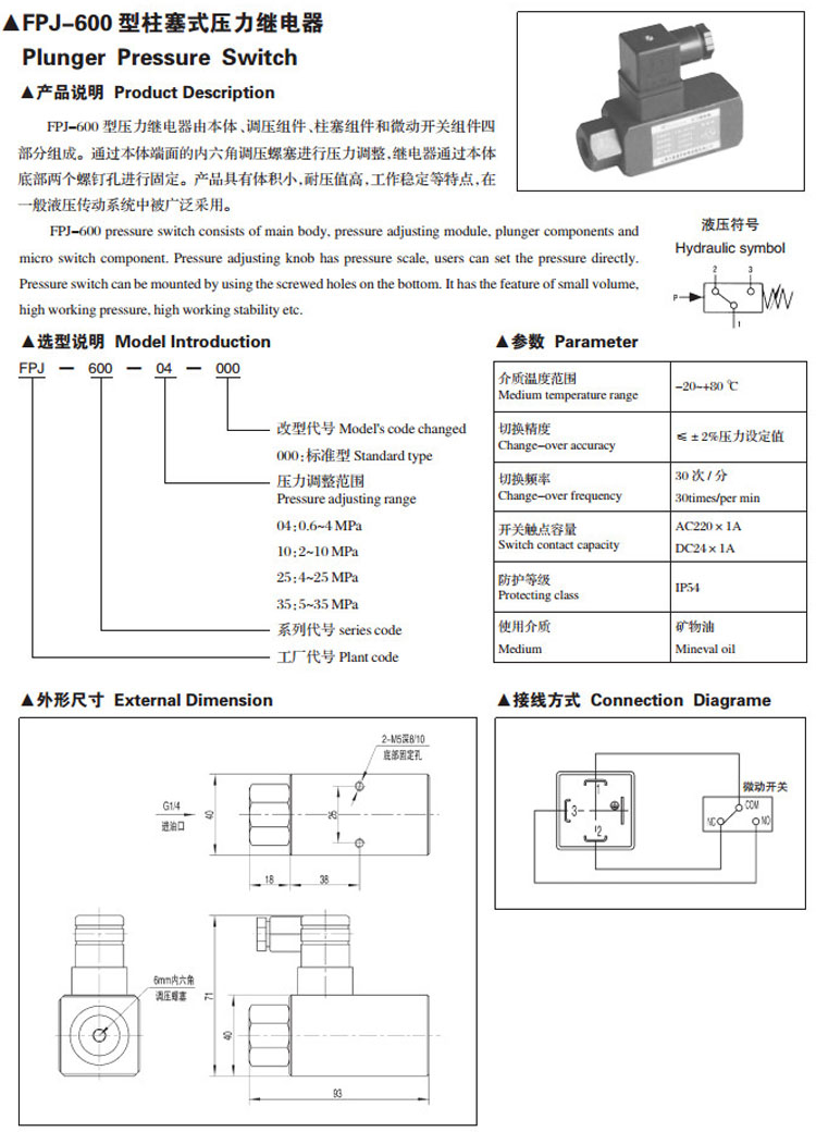 FPJ-600-04,FPJ-600-10,FPJ-600-25,FPJ-600-35,柱塞式壓力繼電器