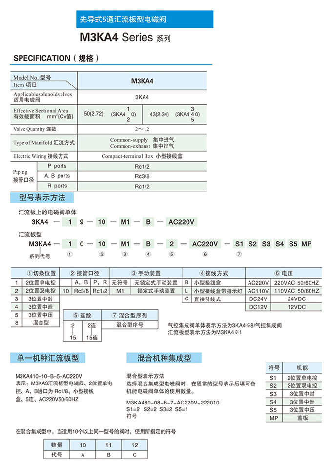 M3KA410-10,M3KA420-10,M3KA430-10,M3KA440-10,M3KA450-10,M3KA480-10,M3KA410-10-B,先導式5通匯流板型電磁閥 |