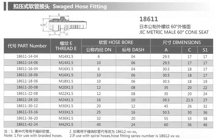 18611-14-04,18611-16-04,18611-20-08,18611-30-12,18611-42-24,扣壓式軟管接頭