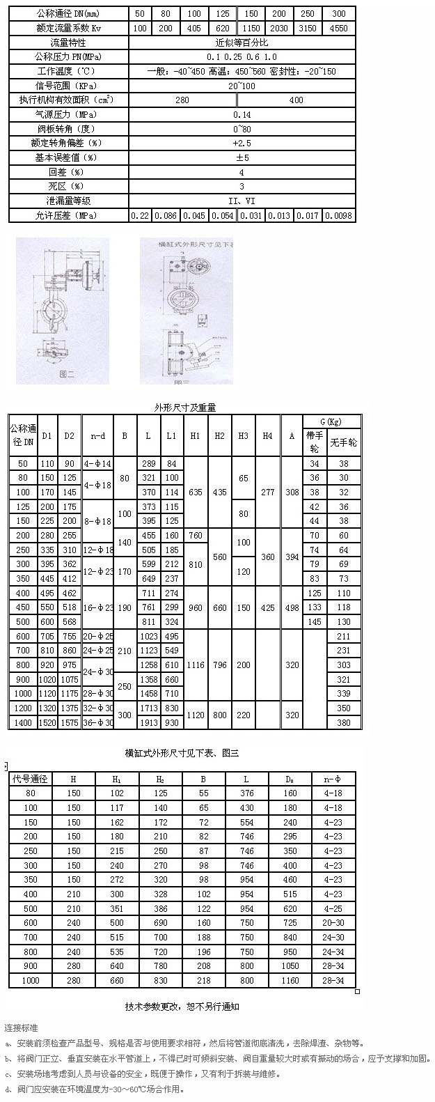 本系列產(chǎn)品有標(biāo)準(zhǔn)型、高溫型及密封型三種。產(chǎn)品公稱壓力等級有0.1、0.25、0.6、1.0MPa,口徑由50mm至1400mm,泄漏量等級有II級和VI級,流量特性為近似等百分比。
