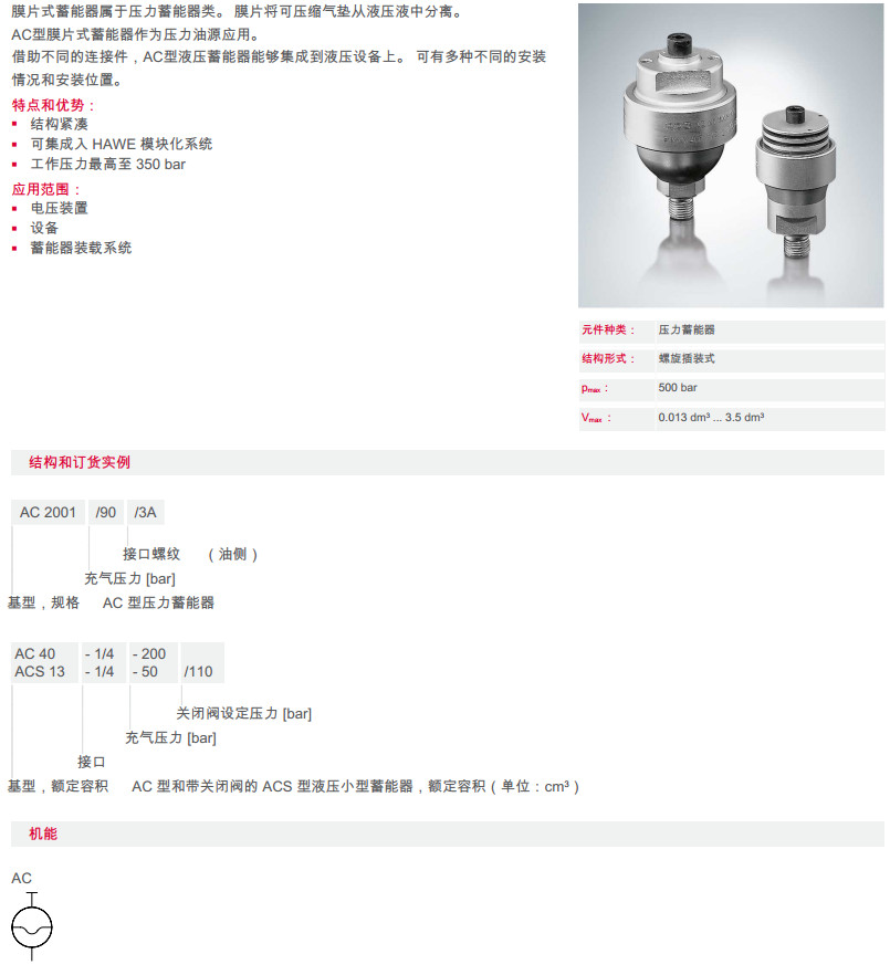 AC13-1/4,ACS13-1/4,AC40-1/4,AC0725/1A,AC202/2A,AC322/2A,蓄能器