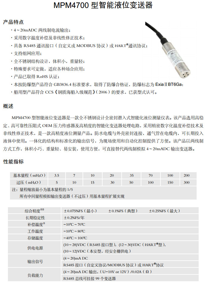 MPM4700-3.5,MPM4700-7,MPM4700-10,MPM4700-20,MPM4700-35,MPM4700-70,智能液位變送器 |