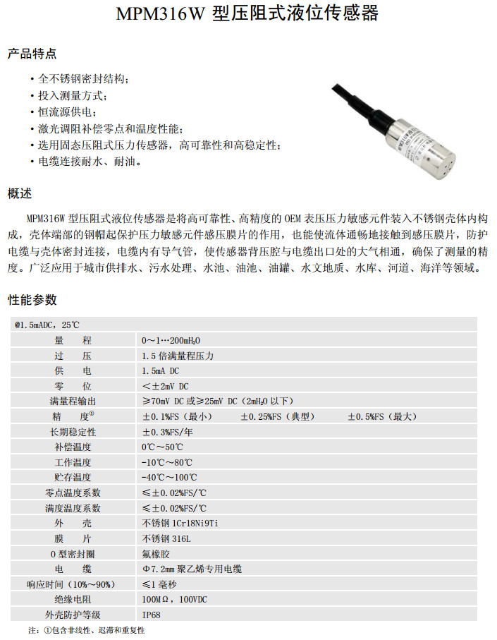 MPM316W,壓阻式液位傳感器