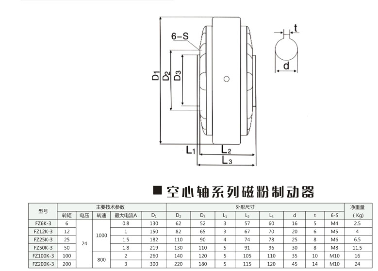 FZ6K-3,FZ12K-3,FZ25K-3,FZ50K-3,FZ100K-3,FZ200K-3,空心軸磁粉制動器