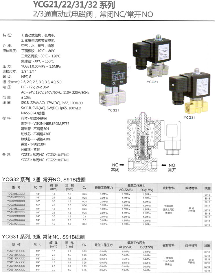 YCG21,YCG22,YCG31,YCG32,YCG2216,YCG2116,YCG2130,YCG2225,YCG3116,YCG3125,YCG3230,直動式電磁閥