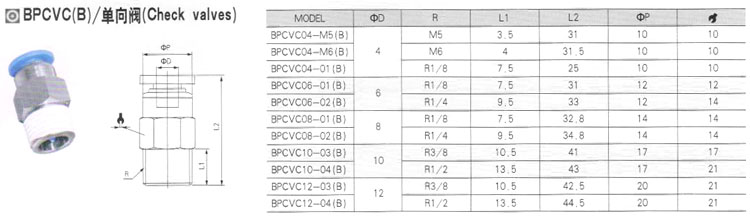 BPCVC04-M5(B),BPCVC06-01(B),BPCVC08-01(B),BPCVC10-03(B),BPCVC12-03(B),單向閥