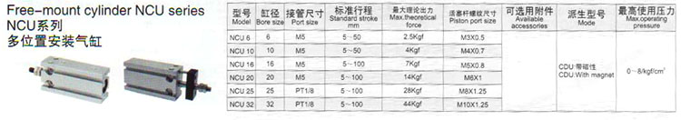 NCU6,NCU10,NCU16,NCU20,NCU25,NCU32,多位置安裝氣缸