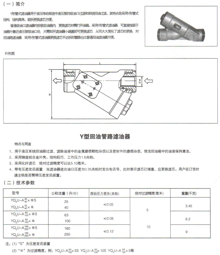 YQ2U-A25*5S,YQ2U-A40*5,YQ2U-A63*10,YQ2U-A160*10S,YQ2U-A250*10,Y型油管路濾油器 |