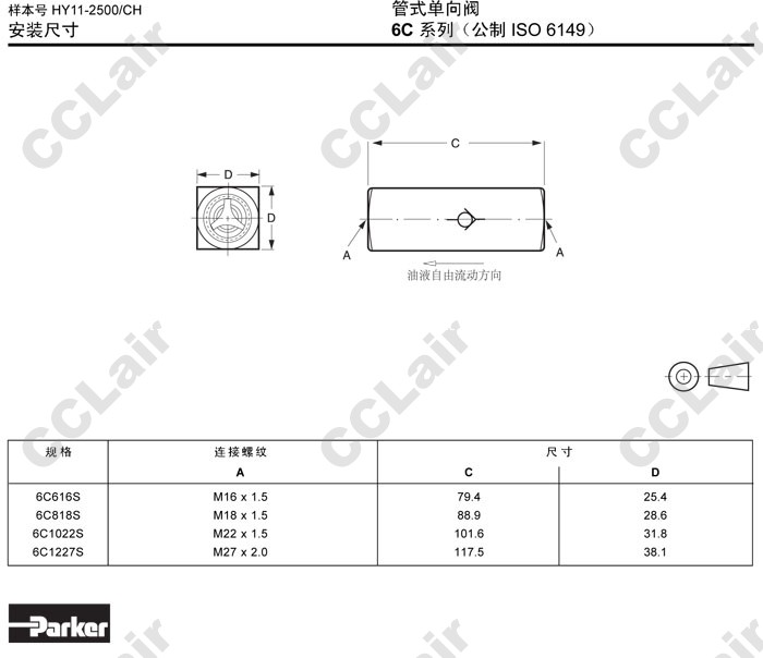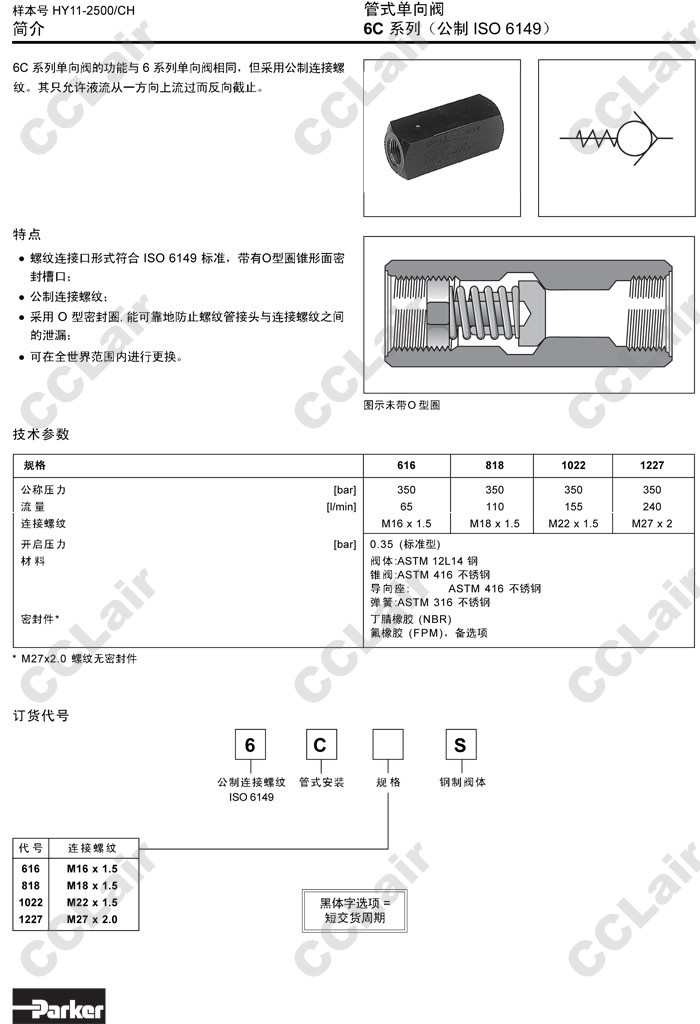 6C616S,6C818S,6C1022S,6C1227S,Parker管式單向閥