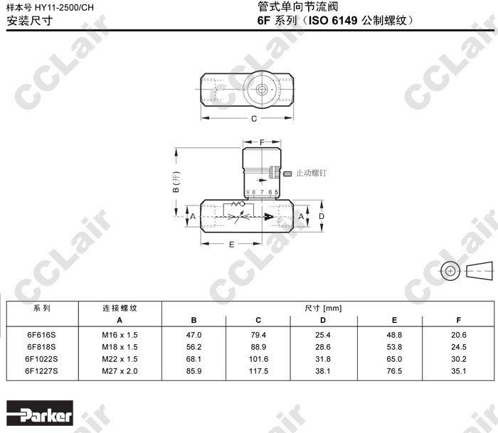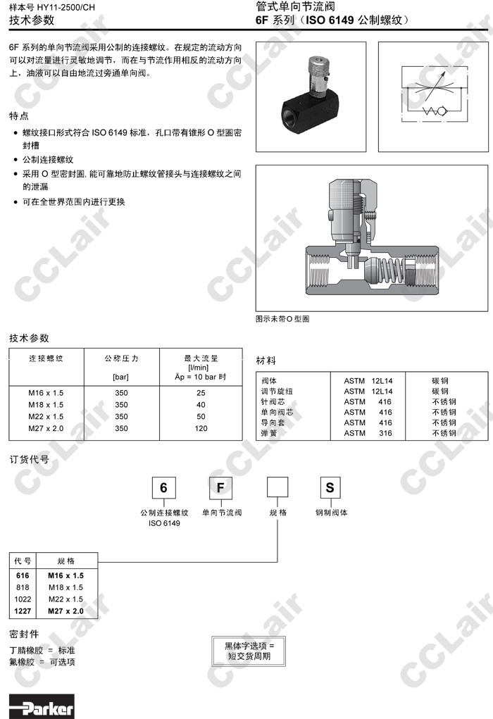 6F616S,6F818S,6F1022S,6F1227S,Parker管式單向節(jié)流閥