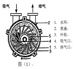 如圖(1)所示2BV水環(huán)真空泵葉輪3偏心地安裝在泵體之內(nèi),起動(dòng)時(shí)向泵內(nèi)注入一定高度的水,因此當(dāng)葉輪3旋轉(zhuǎn)時(shí),水受離心力的作用而在泵體內(nèi)壁形成一旋轉(zhuǎn)水環(huán)1,水環(huán)下部內(nèi)表面與輪轂相切,沿箭頭方向旋轉(zhuǎn),在前半轉(zhuǎn)過程中,水環(huán)內(nèi)表面逐漸與輪轂脫離,因此在葉輪葉片間功與水環(huán)形成封閉空間,隨著葉輪的旋轉(zhuǎn),該空間逐漸擴(kuò)大,空間氣體壓力降低,氣體自圓盤吸氣被吸入;在后半轉(zhuǎn)過程中,水環(huán)內(nèi)表面逐漸與輪轂靠近,葉片空間逐漸縮小,空間氣體壓力升高,高于排氣口壓力時(shí),葉片間的氣體自圓盤排氣口被排出。如此葉輪每轉(zhuǎn)動(dòng)一周,葉片間的空間吸排氣一次,許多空間不停地工作,2BV水環(huán)式真空泵就連續(xù)不斷地抽吸或壓送氣體。
