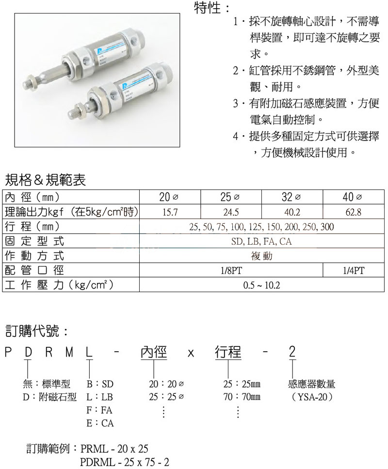 PDRMB-20,PRMB-25,PDRML-32,PDRMF-40,PDRME-20,PRML-25,不旋轉(zhuǎn)迷你氣缸