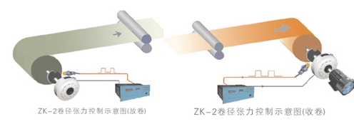 本系統(tǒng)對(duì)收卷滾筒或送料輥筒提供恒定張力控制。收卷滾筒或送料滾筒的物料需要恒定張力,本裝置利用滾筒直徑的連續(xù)變化,逐步線(xiàn)性地減少(或增加)磁粉制動(dòng)器(或磁粉離合器)的勵(lì)磁電流,從而改變對(duì)滾筒的制動(dòng)(或離合)的力矩。在轉(zhuǎn)動(dòng)的滾筒軸旁安裝接近傳感器來(lái)檢測(cè)滾筒直徑的變化,將檢測(cè)到的滾筒直徑變化反饋給體儀表,使其輸出一個(gè)與之相應(yīng)的控制電流。本儀表有開(kāi)始半徑及終止半徑設(shè)定,當(dāng)滾筒到達(dá)終止直徑時(shí)儀表自動(dòng)蜂鳴報(bào)警。