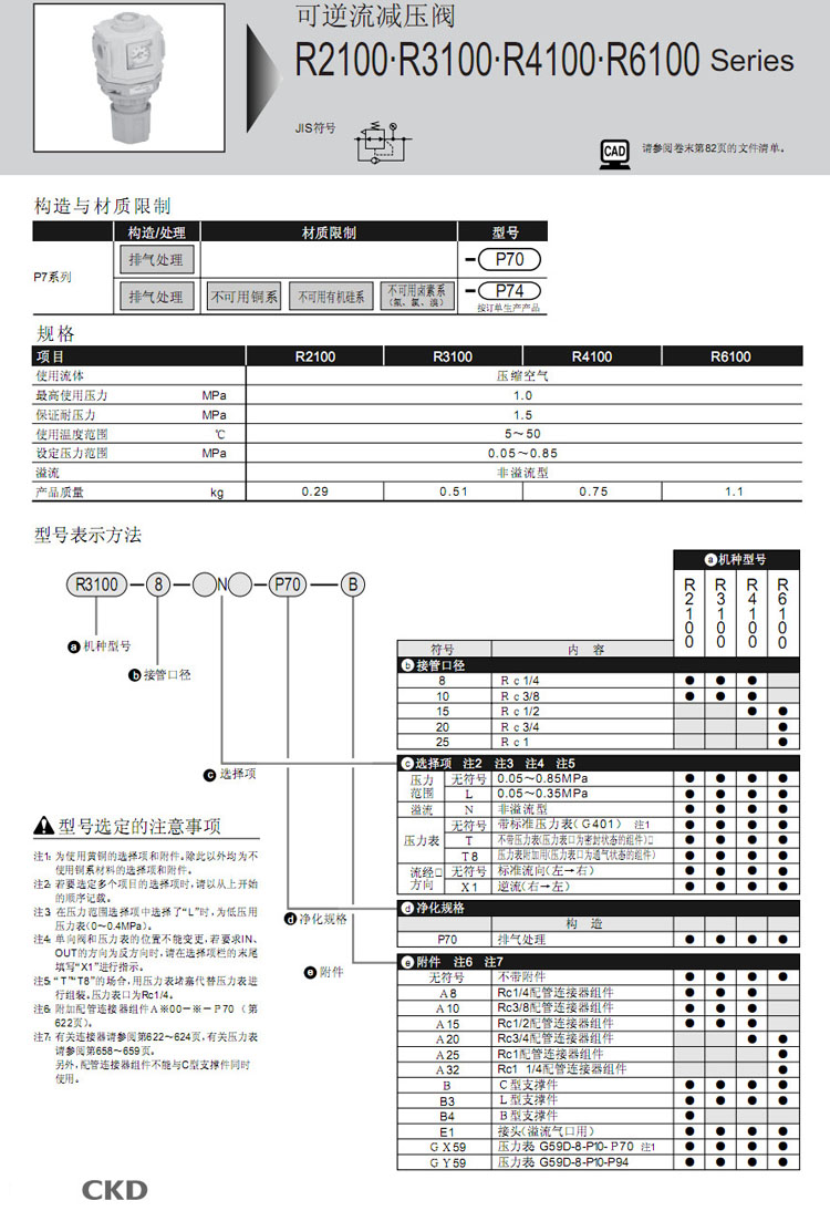 R2100-8,R2100-10,R3100-8,R3100-10,R4100-8,R4100-10,R4100-15,R6100-15,R6100-20,R6100-25,CKD可逆流減壓閥 |
