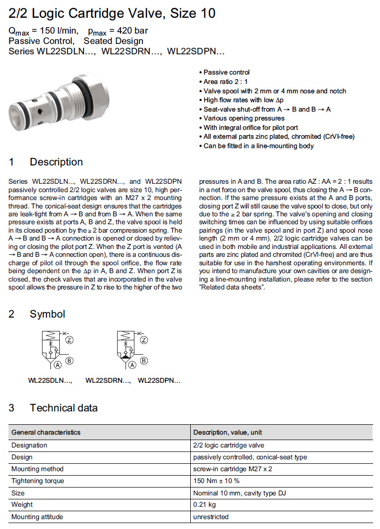WL22SDR4,WL22SDR5,WL22SDL1,WL22SDL2,WL22SDL3,WL22SDP6,WL22SDP7,WL22SDP8,Bucher邏輯插裝閥