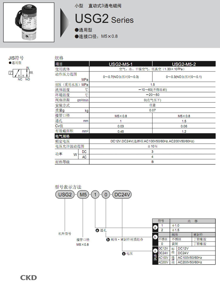 USG2-M5-1,USG2-M5-2,CKD直動(dòng)式3通電磁閥