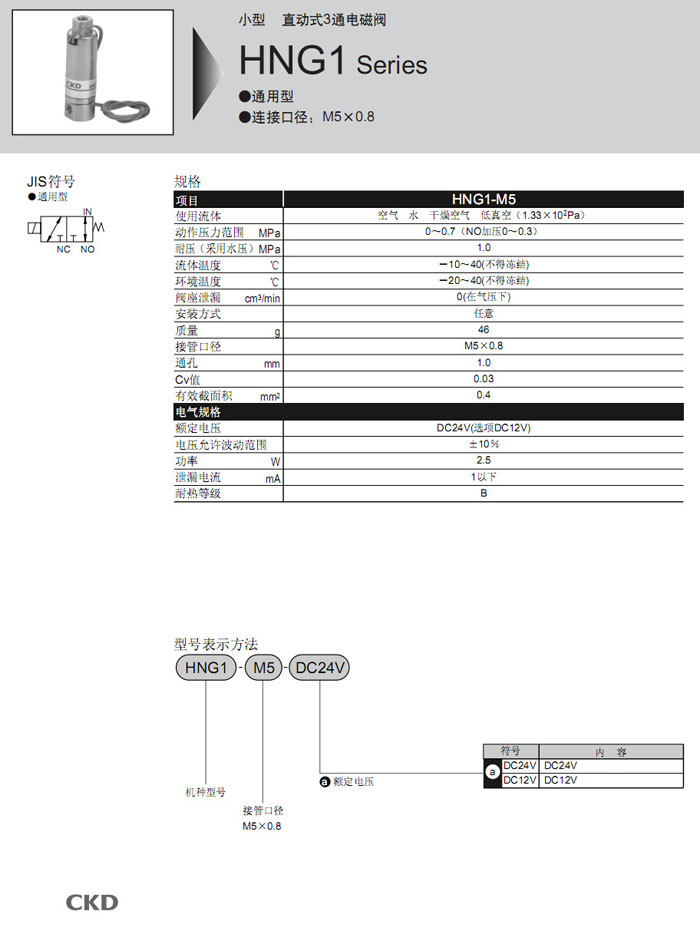 HNG1-M5,CKD直動式3通電磁閥