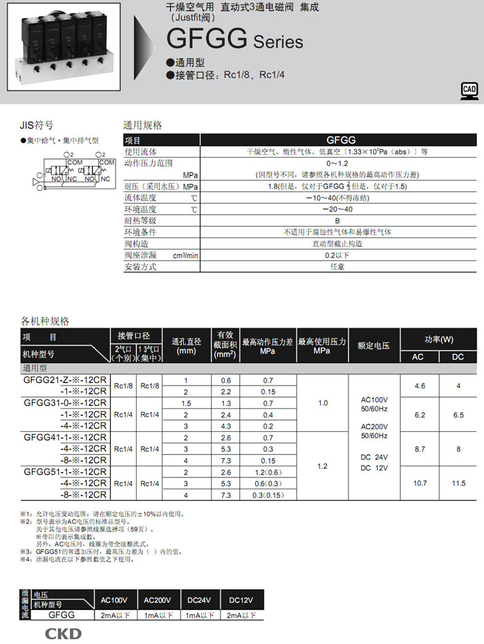 GFGG21-Z-2-12CR,GFGG31-0-2-12CR,GFGG41-1-2-12CR,GFGG51-1-2-12CR,CKD直動(dòng)式3通電磁閥