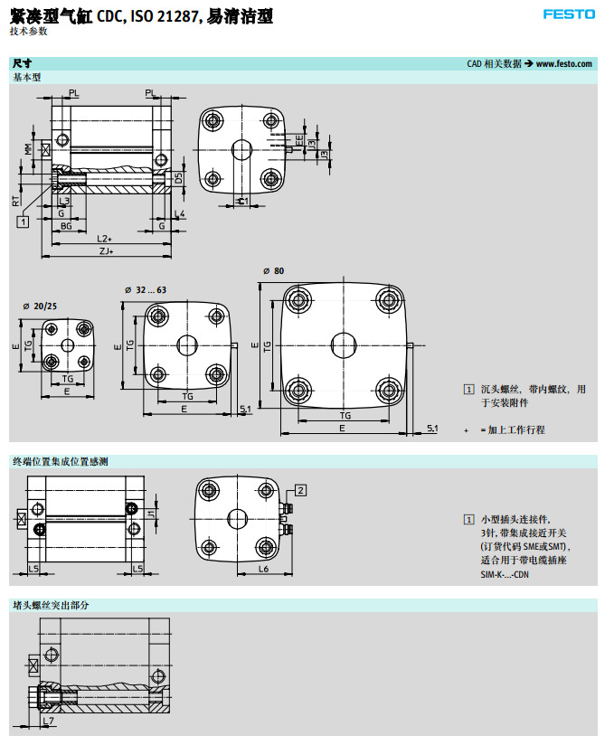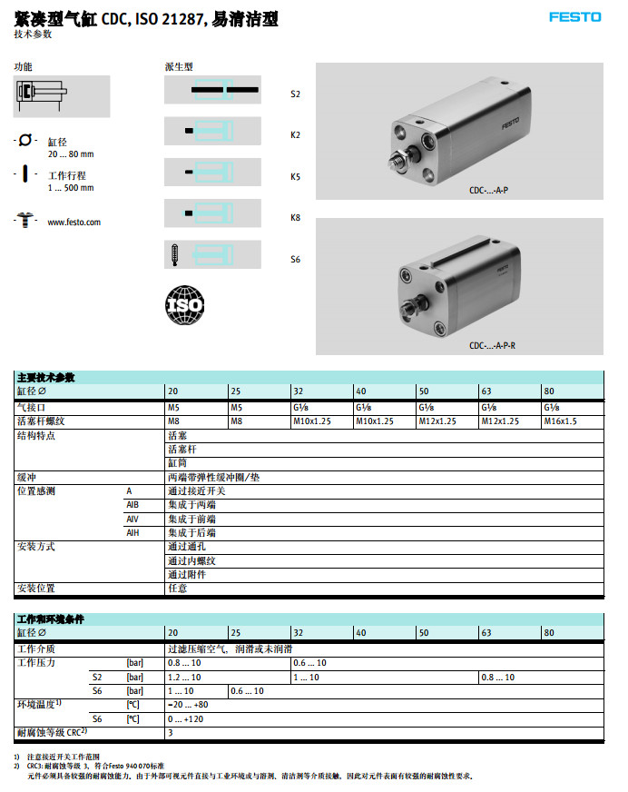 CDC-20,CDC-25,CDC-32,CDC-40,CDC-50,CDC-63,CDC-80,festo緊湊型氣缸