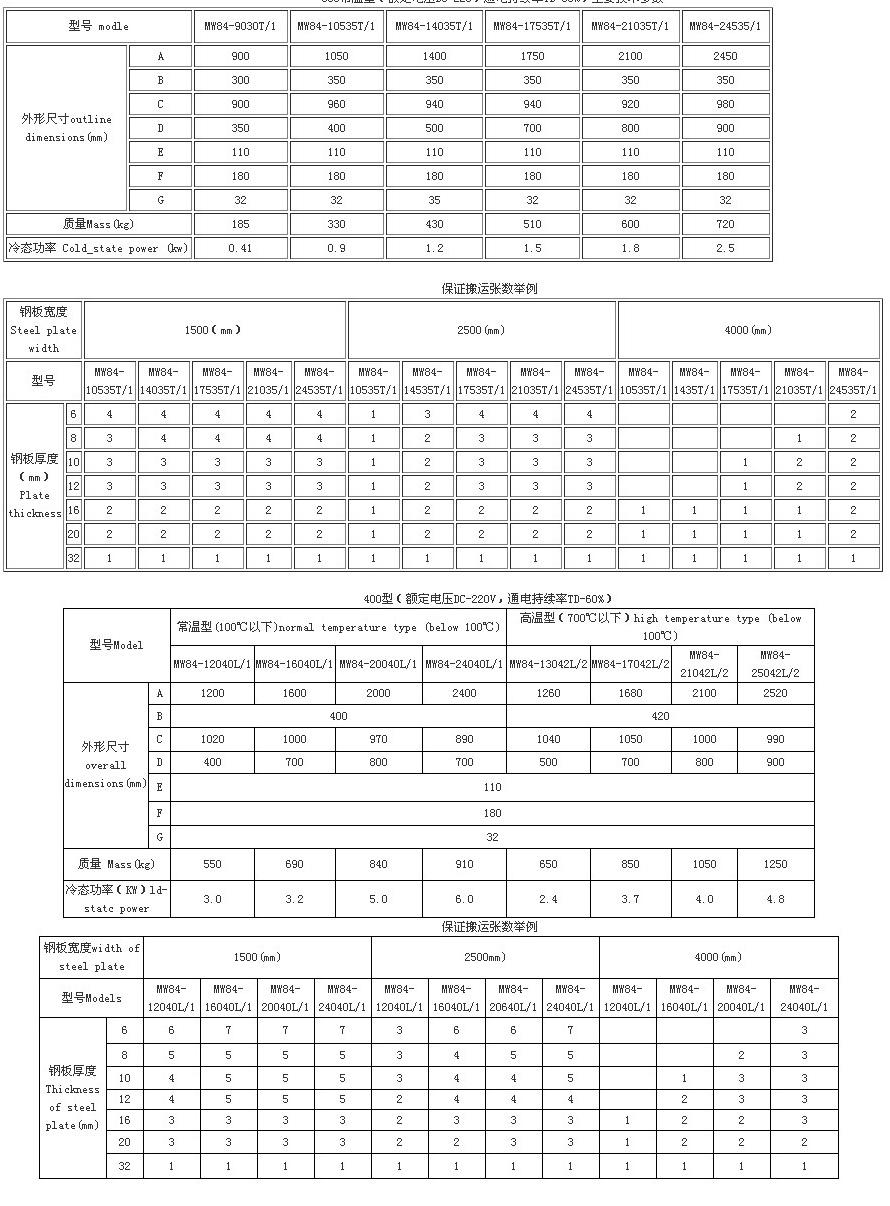 本系列產品是專為吊運中厚鋼板而設計的。吊運作業(yè)安全準確迅速。考慮到長鋼板吊運可能出現(xiàn)彎曲變形而影響安全搬運,所以在吊運長尺寸鋼板時,請使用多臺電磁鐵聯(lián)用。對于中厚板(6mm-32mm)電磁鐵的間距多取3-4米,兩端外伸部分的長度可取間距的二分之一。根據(jù)吊運張數(shù)的不同,又分為350型和400型兩類。350型適合于中厚板長、造船廠、機械制造廠,采用調磁控制方式,能起吊一張或一定張數(shù)鋼板。400型適用于一次搬運盡量多的張數(shù),可根據(jù)用戶要求另行設計制造吊運700℃一下鋼板用高溫型產品。