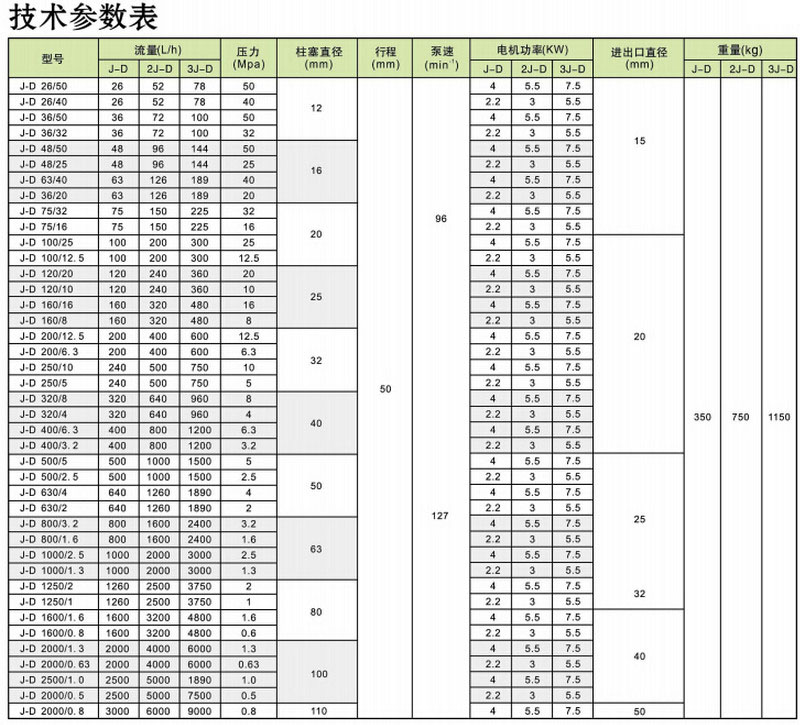 J-D-26/50,J-D-26/40,J-D-36/50,J-D-36/32,J-D-48/50,J-D-48/25,J-D-63/40,柱塞式計量泵