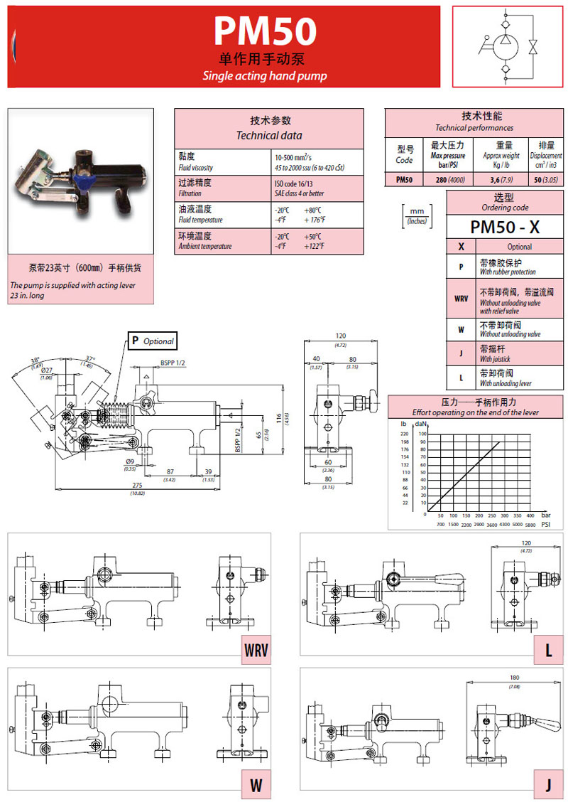 PM50-P,PM50-WRV,PM50-W,PM50-J,PM50-L,單作用手動泵