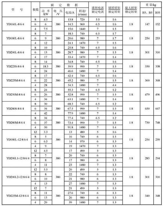 YD112M-8/6/4,YD132S-8/6/4,YD132M1-8/6/4,YD132M2-8/6/4,YD160M-8/6/4,YD160M-6/4/2,