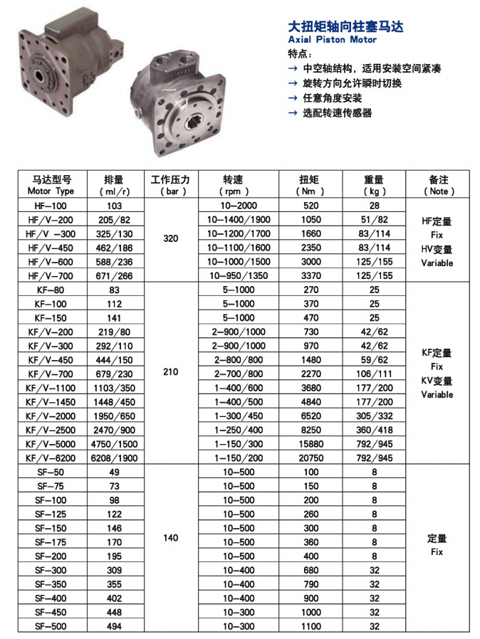 HF-100,HF/V-200,KF-100,KF-150,KF/V-200,KF/V-300,SF-75,SF-100,大扭矩軸向柱塞馬達