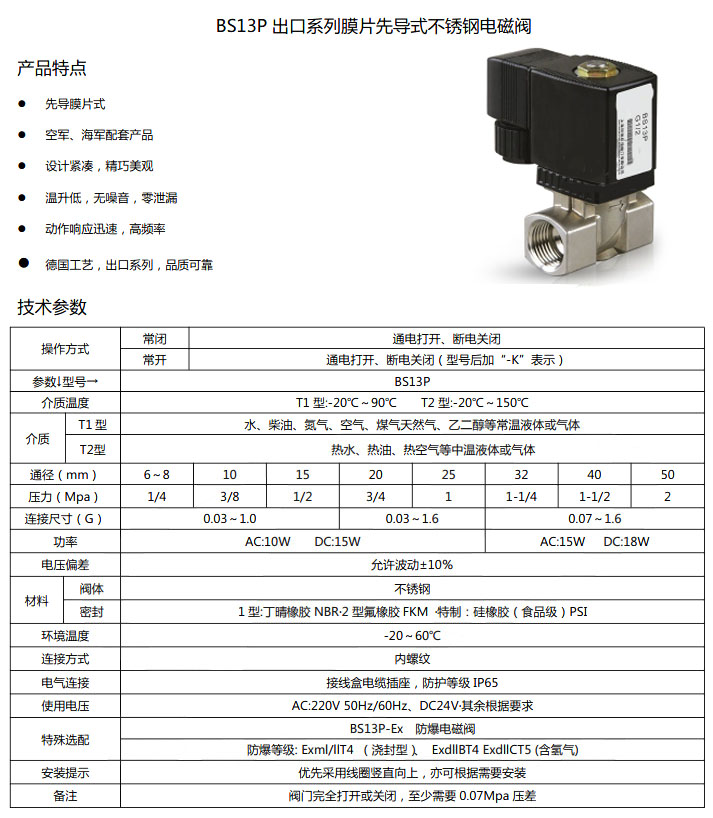 BS13P-DN6,BS13P-DN8,BS13P-DN10,BS13P-DN15,BS13P-DN20,膜片先導(dǎo)式不銹鋼電磁閥