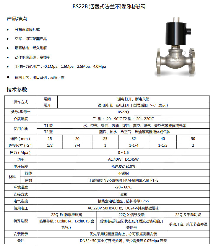 BS22B-DN15,BS22B-DN20,BS22B-DN25,BS22B-DN32,BS22B-DN40,BS22B-DN50,活塞式法蘭不銹鋼電磁閥