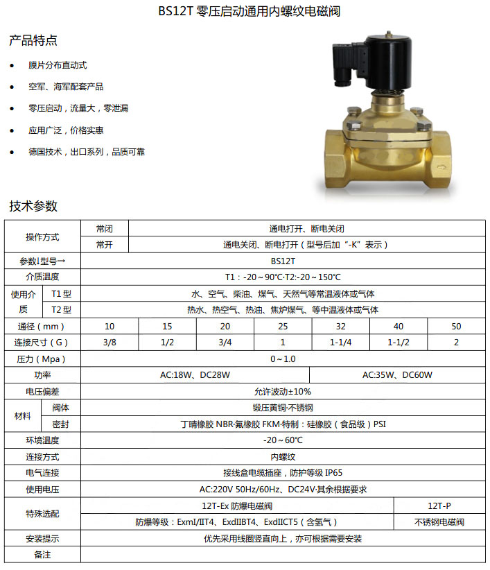 BS12T-DN10,BS12T-DN15,BS12T-DN20,BS12T-DN25,BS12T-DN32,BS12T-DN40,BS12T-DN50,通用黃銅電磁閥