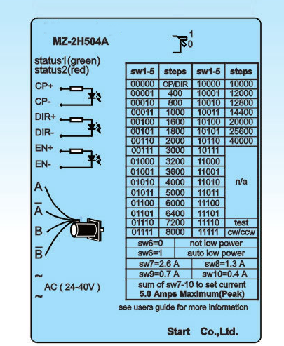 MZ-2H504A型驅(qū)動(dòng)器,主要用于驅(qū)動(dòng)86型、相電流為5A及以下的二相混合式電機(jī)。其運(yùn)行步數(shù)(細(xì)分?jǐn)?shù))達(dá)到22種,最大步數(shù)4萬(wàn),通過(guò)撥位開關(guān)的第1-5位來(lái)設(shè)定步數(shù)。具有單雙脈沖方式,自測(cè)試功能,相位記憶功能,自動(dòng)半電流功能。本驅(qū)動(dòng)器可以輸出的最大電流為5.0A(峰值),可以很方便的通過(guò)撥位開關(guān)的第7-10位來(lái)設(shè)定你需要的輸出電流(可以設(shè)定16檔電流,設(shè)定分辨率0.4A)。本驅(qū)動(dòng)器交、直流供電均可,交流供電電壓下限值A(chǔ)C24V、上限值A(chǔ)C40V、典型值A(chǔ)C32V;本機(jī)也可以直流供電,接入時(shí)不分正負(fù),直流供電電壓下限值DC40V、上限值DC60V、典型值DC50V。其供電功率不小于140W。