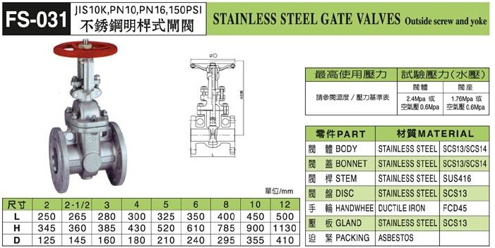 FS031不銹鋼明桿式閘閥可廣泛用于自來水,污水,建筑,石油,化工,食品,醫(yī)藥,輕紡,電力,船舶,冶金,能源系統(tǒng)等流體管線上作爲(wèi)調(diào)節(jié)和截流裝置使用。富山引進(jìn)歐洲高科技閥門制造技術(shù)所生産的彈性座封閘閥,利用閘門整體包膠産生變形補(bǔ)償作用達(dá)到良好的密封效果,克服了一般閘閥密封不良、漏水和生鏽的現(xiàn)象。