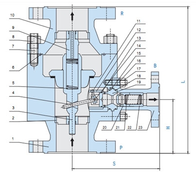 根據(jù)感應(yīng)到的主路流量不同,自動(dòng)再循環(huán)閥的主閥瓣止回錐將自動(dòng)移動(dòng)到某一個(gè)位置上。同時(shí)主閥瓣帶動(dòng)旁路閥杠桿,將主閥瓣動(dòng)作傳遞至旁路,通過(guò)杠桿控制旁路閥閥瓣的位置,改變旁路的節(jié)流面積,從而控制通過(guò)旁路的流量。當(dāng)主閥瓣回至閥座關(guān)閉狀態(tài)時(shí),所有流量通過(guò)旁路回流。當(dāng)主閥瓣上升至頂端位置時(shí),旁路則完全關(guān)閉,所有泵的流量流向工藝系統(tǒng)。該閥集四種功能于一體。
