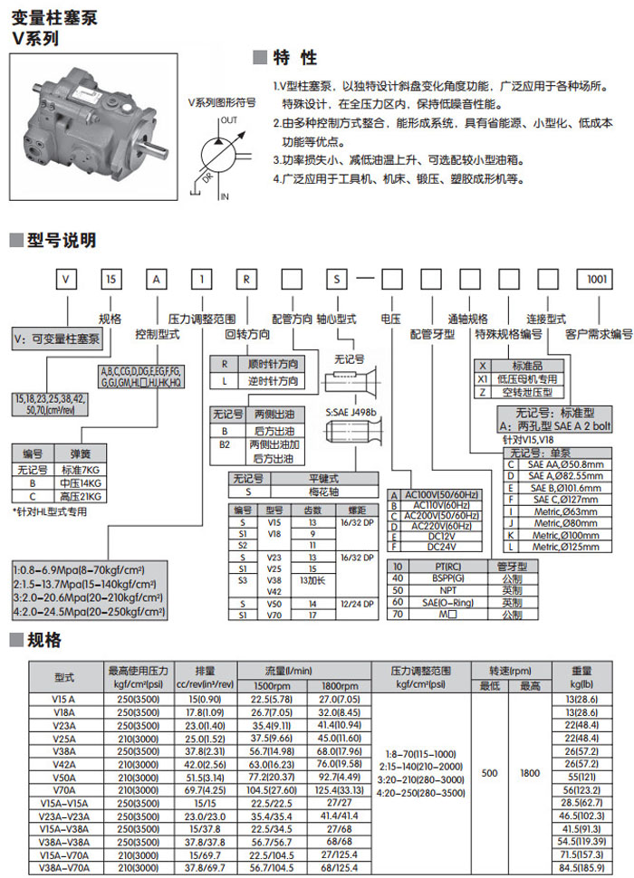 V15,V18,V23,V25,V38,V42,V50,V70,V15A1RBS-A,V23A1RB-F,V50A1RB2-A,變量柱塞泵