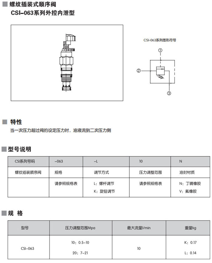 CSI-063-L10N,CSI-063-L20N,CSI-063-K10N,CSI-063-K20N,CSI-063-L10V,CSI-063-L20V,螺紋插裝式順序閥