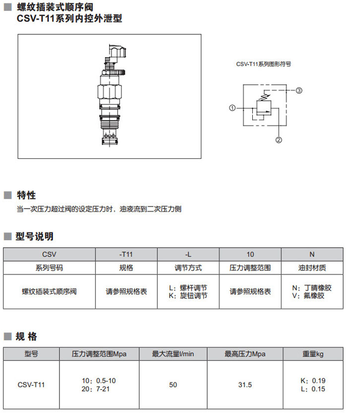 CSV-T11-L10N,CSV-T11-L10V,CSV-T11-K10N,CSV-T11-K10V,CSV-T11-L20N,CSV-T11-L20V,螺紋插裝式順序閥