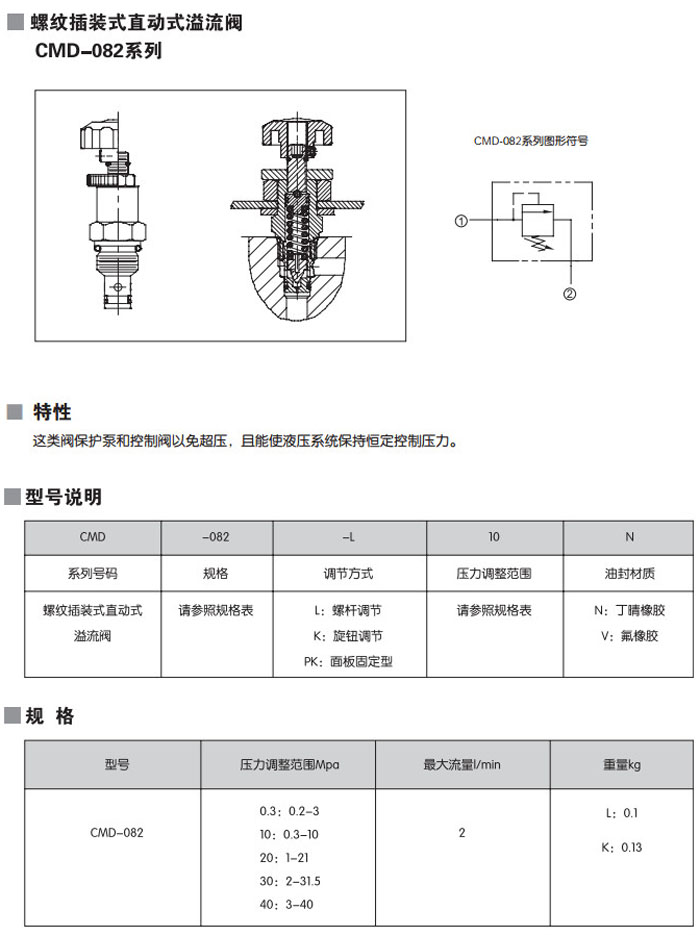 CMD-082-L0.3N,CMD-082-L10N,CMD-082-PK0.3N,CMD-082-L30N,CMD-082-K40N,螺紋插裝式直動(dòng)式溢流閥