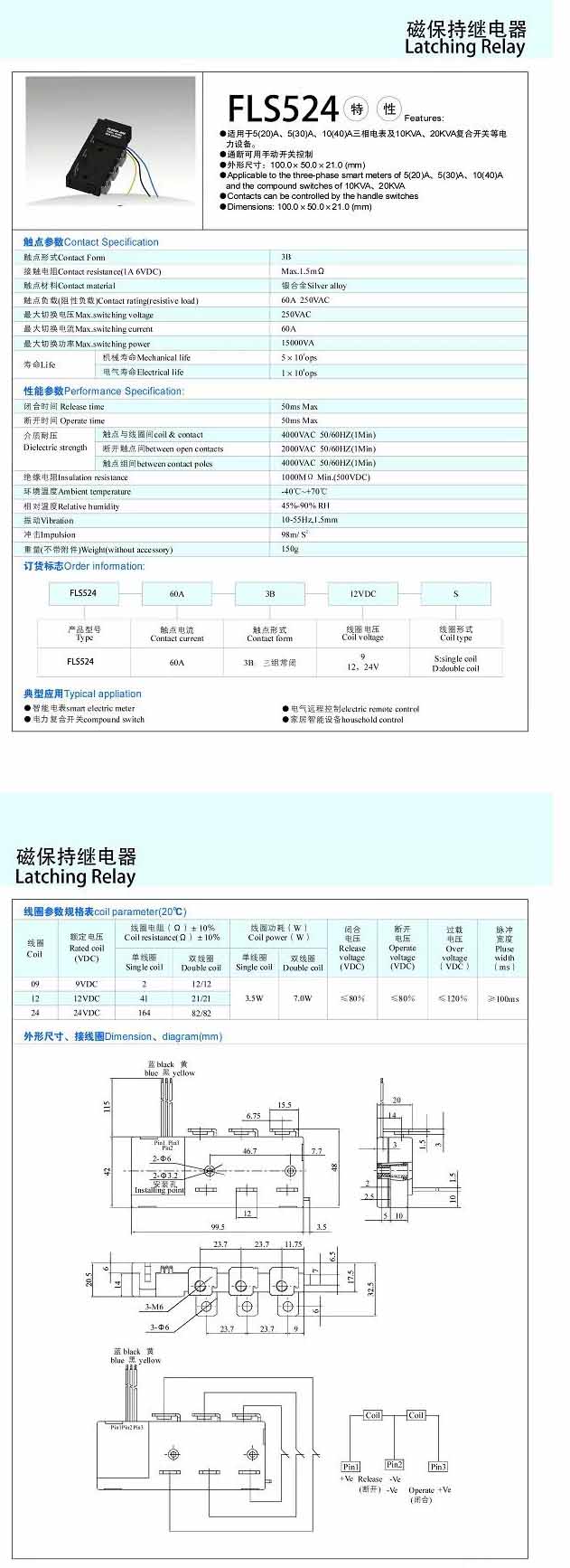 FLS524-60A,磁保持繼電器