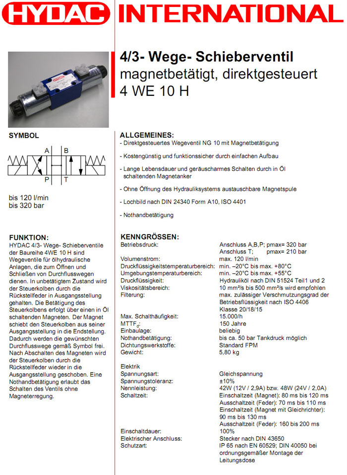 4WE10HS01-12DG/V,4WE10HS01-24DG/V,HYDAC電磁4/3方向滑閥