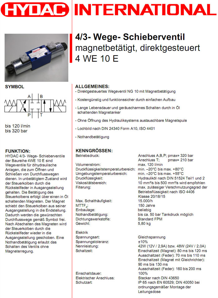 4WE10ES01-12DG/V,4WE10ES01-24DG/V,HYDAC電磁4/3方向滑閥