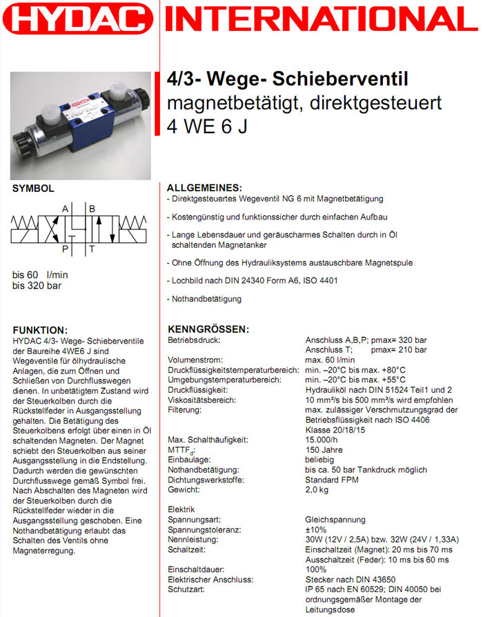 4WE6JS01-12DG/V,4WE6JS01-24DG/V,HYDAC電磁4/3方向滑閥