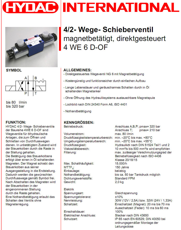 4WE6D-OFS01-12DG/V,4WE6D-OFS01-24DG/V,HYDAC電磁4/2方向滑閥