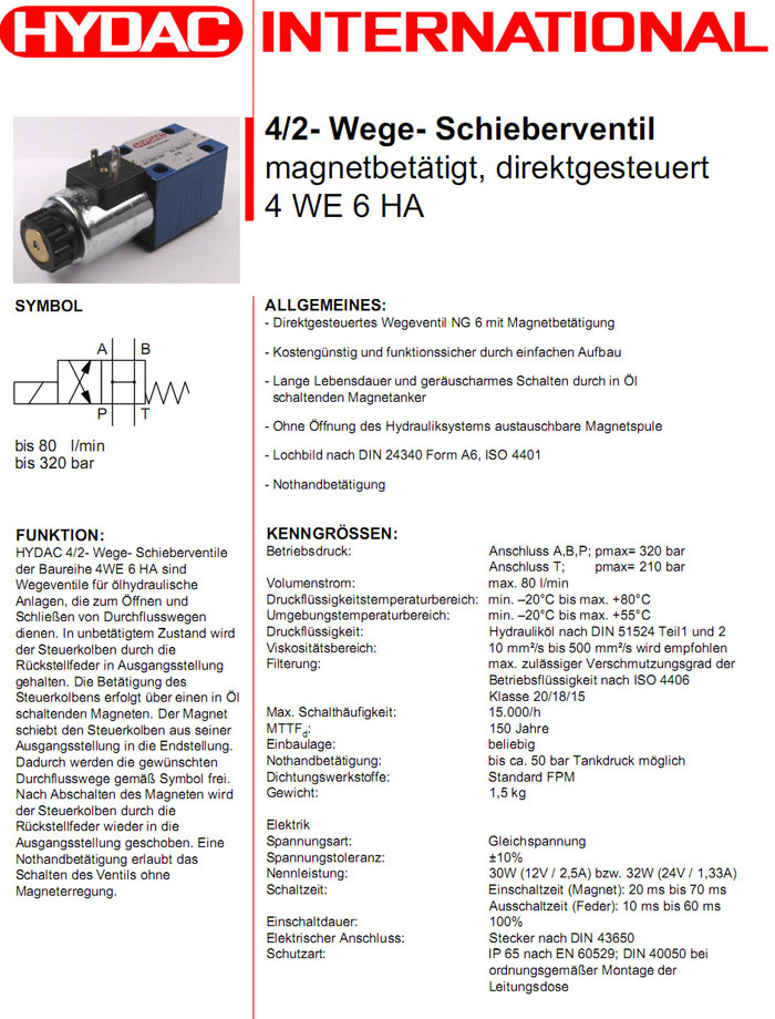 4WE6HAS01-12DG/V,4WE6HAS01-24DG/V,HYDAC電磁4/2方向滑閥