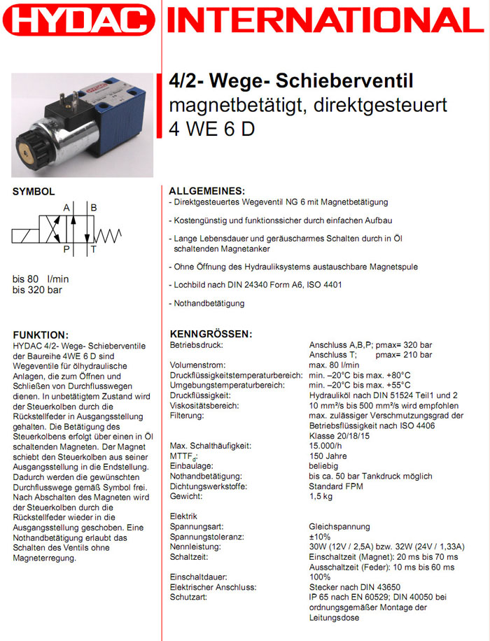 4WE6DS01-12DG/V,4WE6DS01-24DG/V,HYDAC電磁4/2方向滑閥