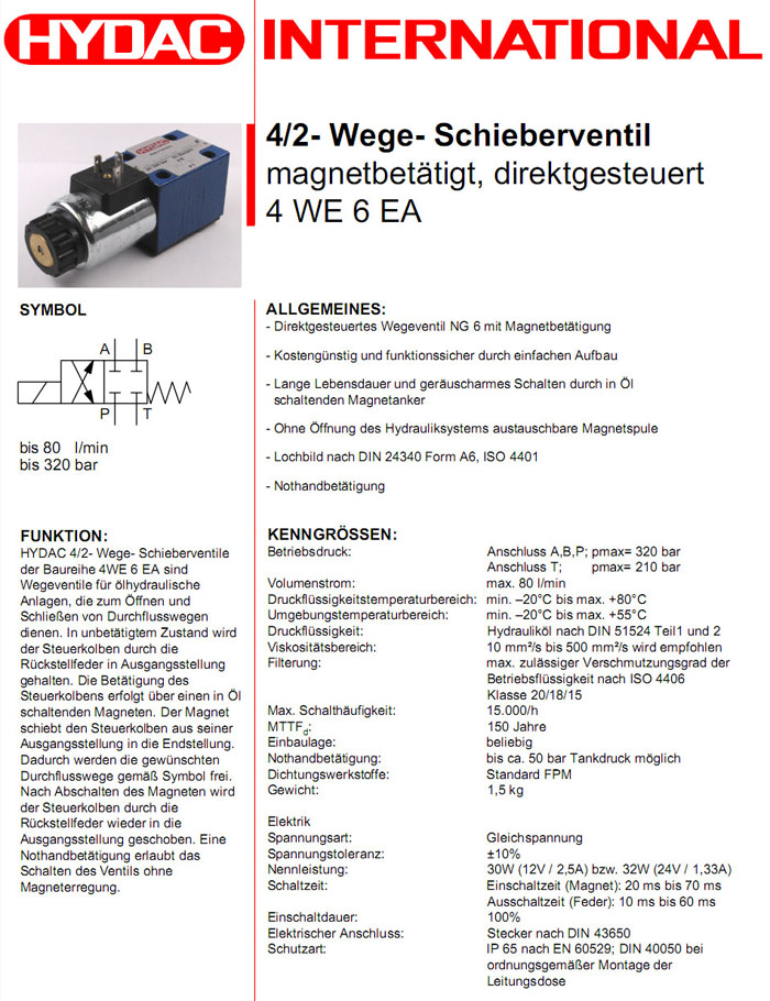 4WE6EAS01-12DG/V,4WE6EAS01-24DG/V,HYDAC電磁4/2方向滑閥